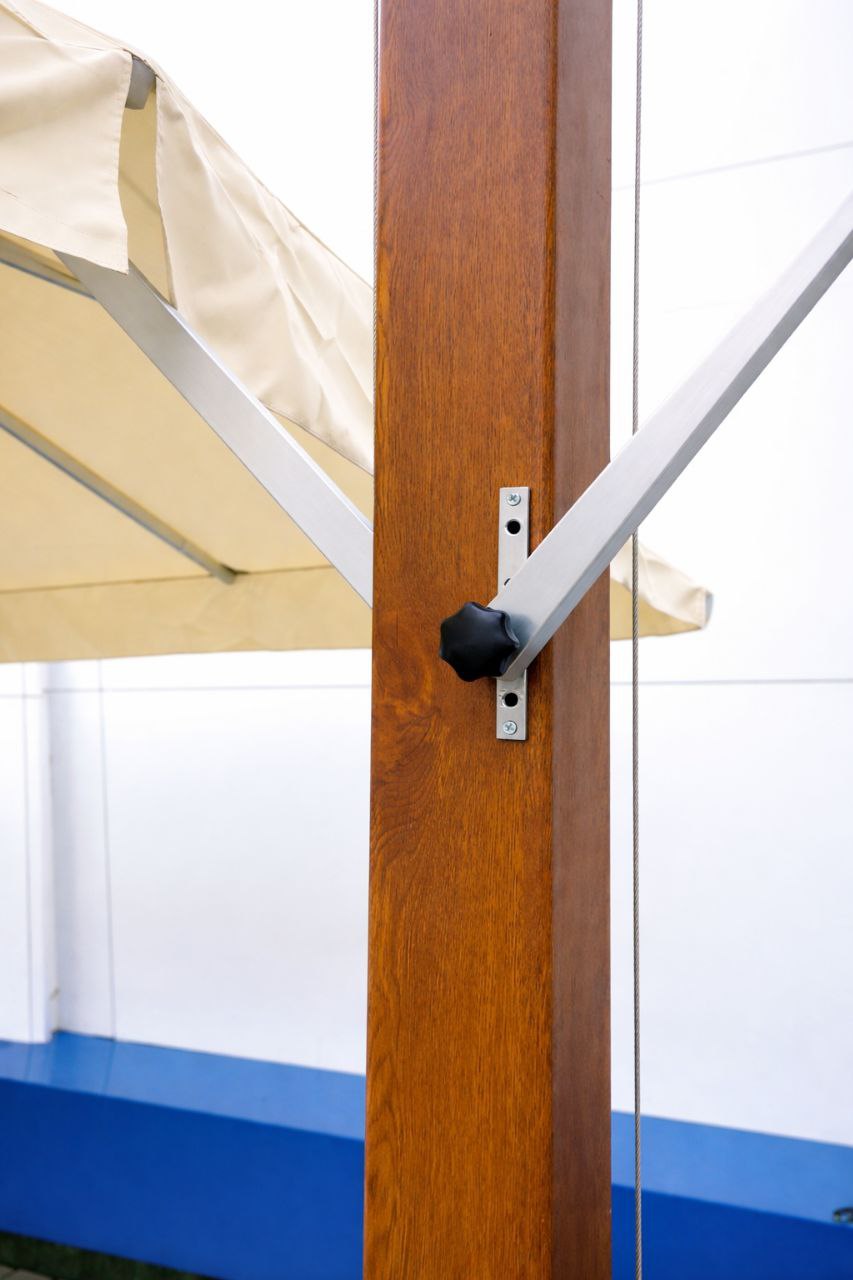 Bez parasoli ulicznych tego typu trudno wyobrazić sobie letnią strefę nowoczesnej kawiarni lub restauracji. W razie potrzeby taki parasol można łatwo wyposażyć w oświetlenie do obsługi letniej strefy restauracyjnej w godzinach wieczornych i nocnych. Charakterystyka: parasol z tej grupy jest przeznaczony na tarasy, na podesty letnie. Kształt kopuły kwadratowy, opcja montażu: na podłodze, typ stojaka parasolowego – boczny, mechanizm otwierania kopuły półautomatyczny. Podstawa parasola stojak krzyżowy. Liczba drutów kopuły -8 (szt.), liczba kopuł w projekcie – 2 (szt.). Kolor – NATURALNY. Okres gwarancji 36 (miesięcy). Słup parasola – metal pokryty farbą pod teksturę drewna w folii termokurczliwej. Elementy metalowe pokryte farbą, druty aluminiowe. Baldachim parasola wykonany z poliestru. Waga parasola wynosi 360kg. Wykończenie: Klapa przeciwwiatrowa, kąt nachylenia kopuły parasola jest regulowany.