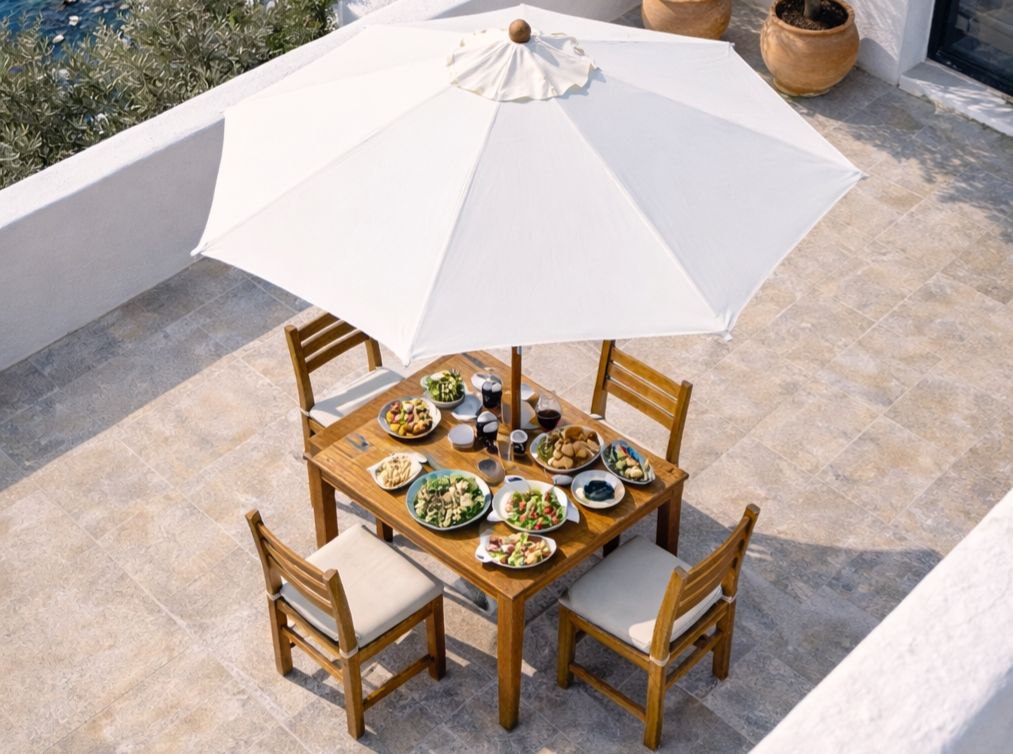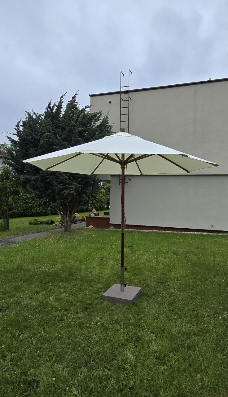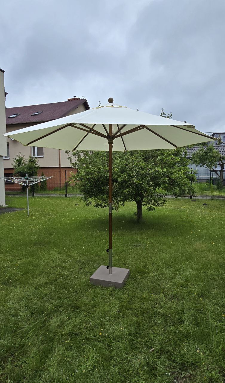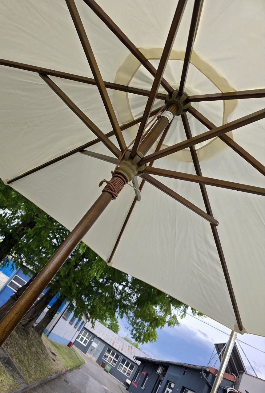 Parasol zewnętrzny De-Luxe Średnica kopuły: 3m (z klapą przeciwwiatrową). Druty: drewniane, 8 szt. Średnica środkowego słupka: 48 mm. Materiał: TWARDE DREWNO (drewno odporne na wilgoć). Tkanina: Poliester 235g/m2.Kolor tkaniny: NATURALNY (odporny na słońce i wodę).