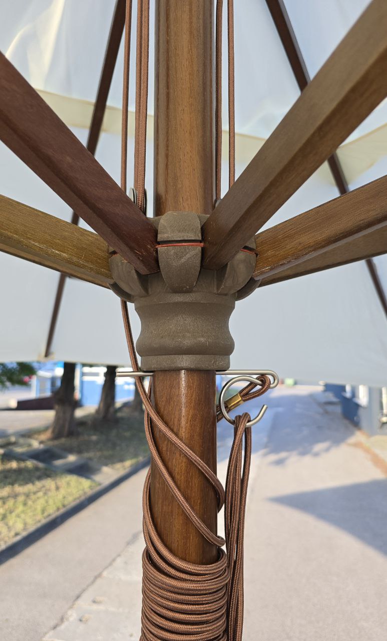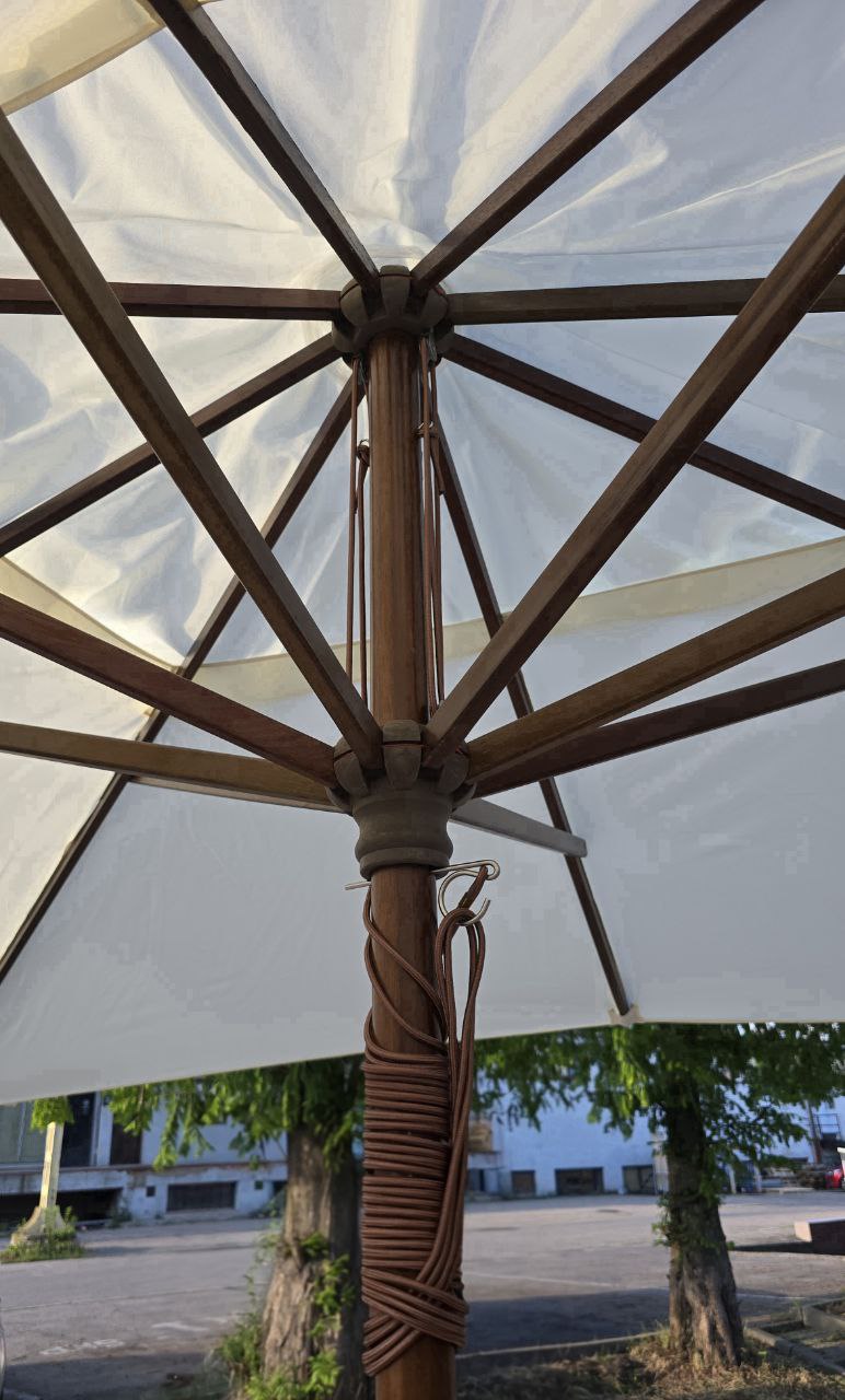 Parasol zewnętrzny Praha, kopuła prostokątna Rozmiar kopuły: 3x4m (z klapą przeciwwiatrową). Druty: drewniane, 8 szt. Średnica środkowego słupka: 48 mm. Materiał: KEMPAS (drewno odporne na wilgoć). Tkanina: Poliester 235g/m2. Kolor tkaniny: NATURALNY (odporny na słońce i wodę).