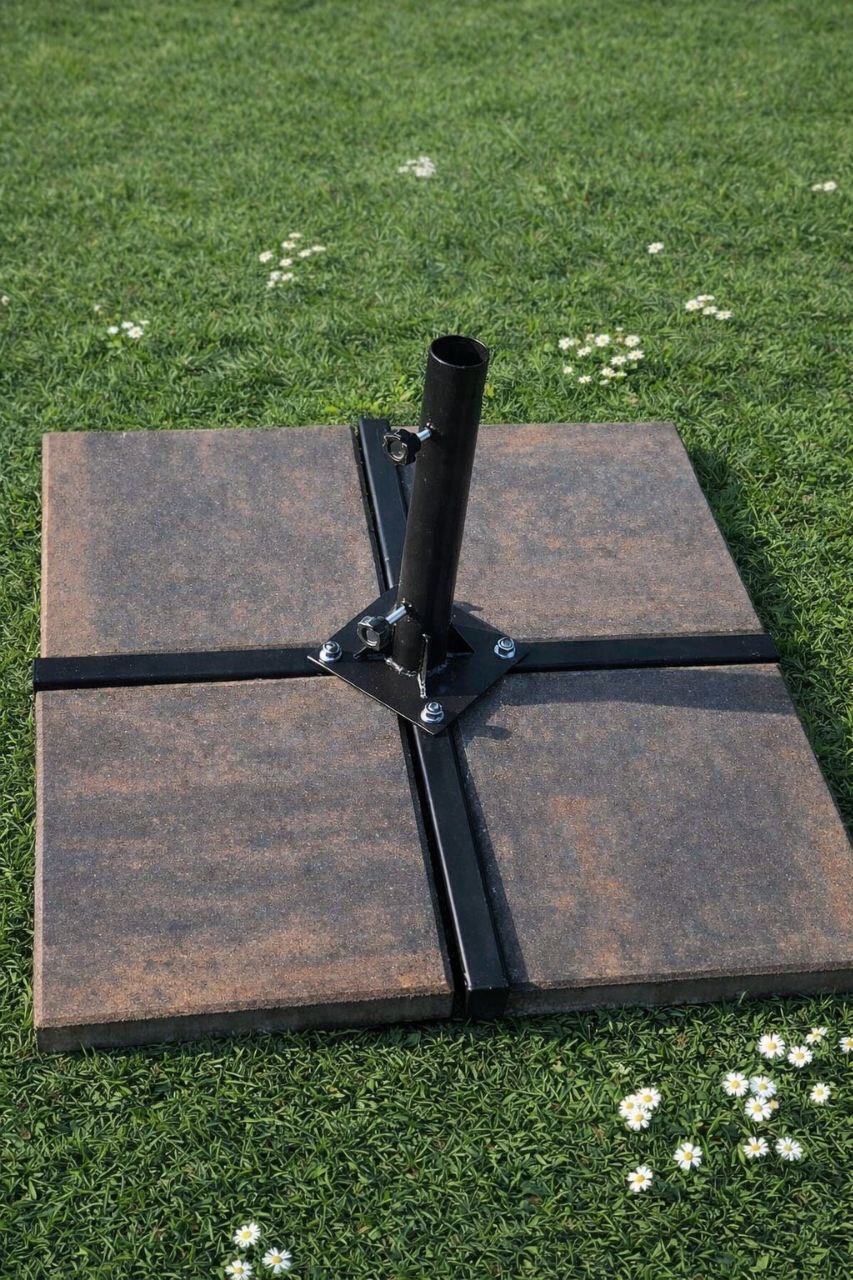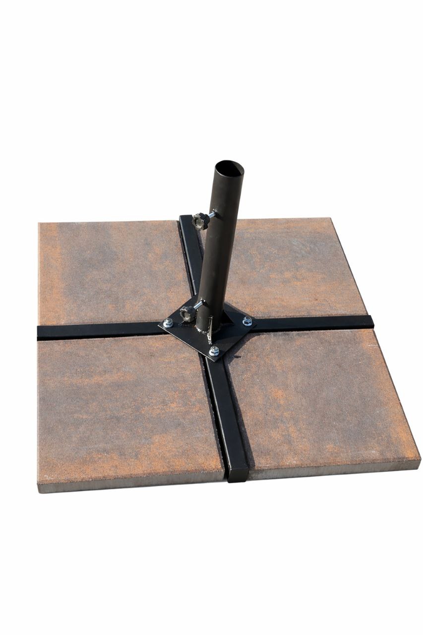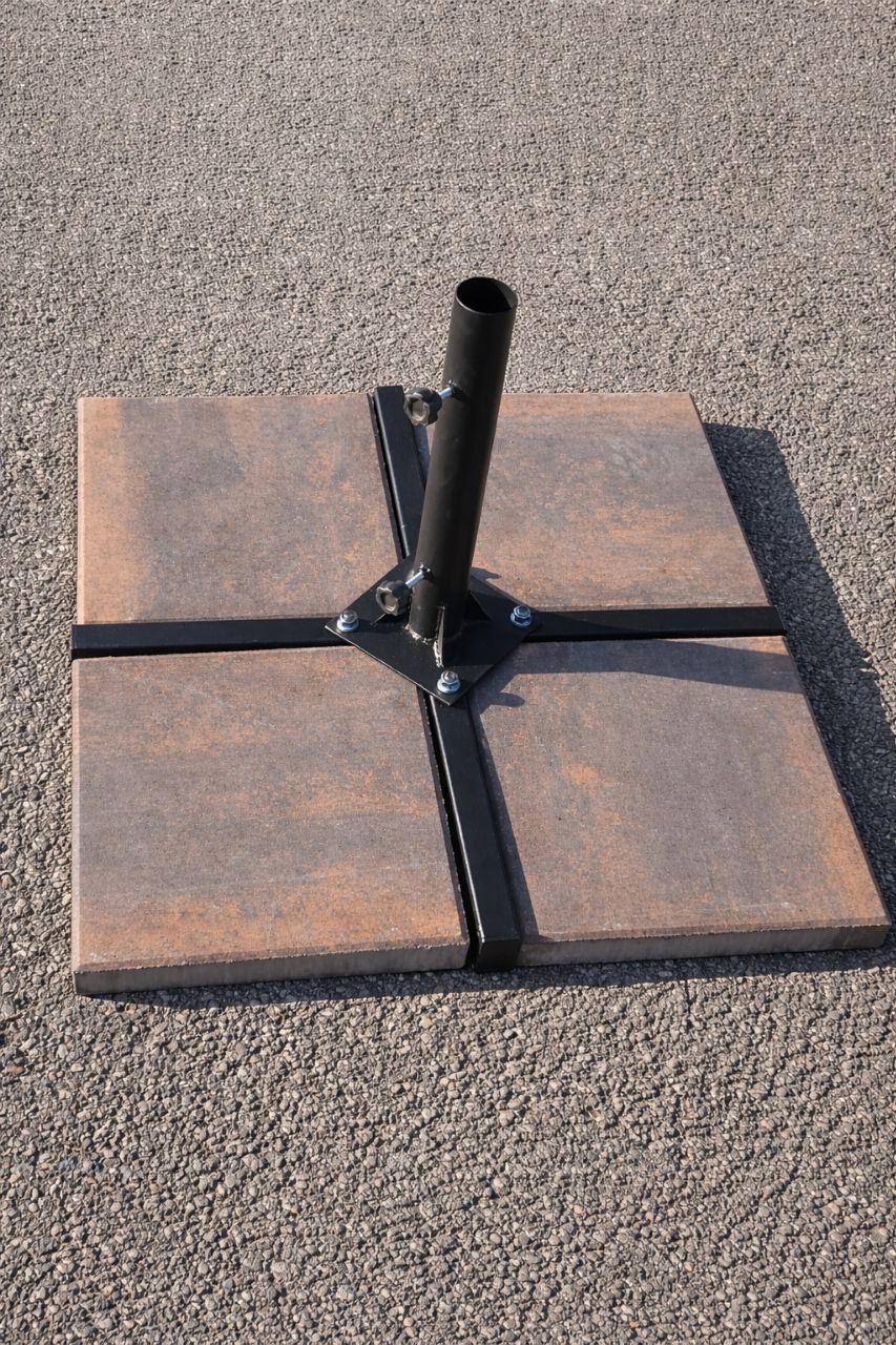 Stojak TN 80 do parasoli Solo,Praha,Genoa,Viena oraz do parasoli z centralnym słupem do 58 mm.Podstawa jest zrobiona w kształcie krzyża ze stali czarnej,material pokryty środkiem antykorozyjnym oraz czarną farbą proszkową.Masa całkowita wraz z płytami betonowymi o wymiarach 40x40x5 wynosi 80kg.Wymiary całkowite 89×89 cm.